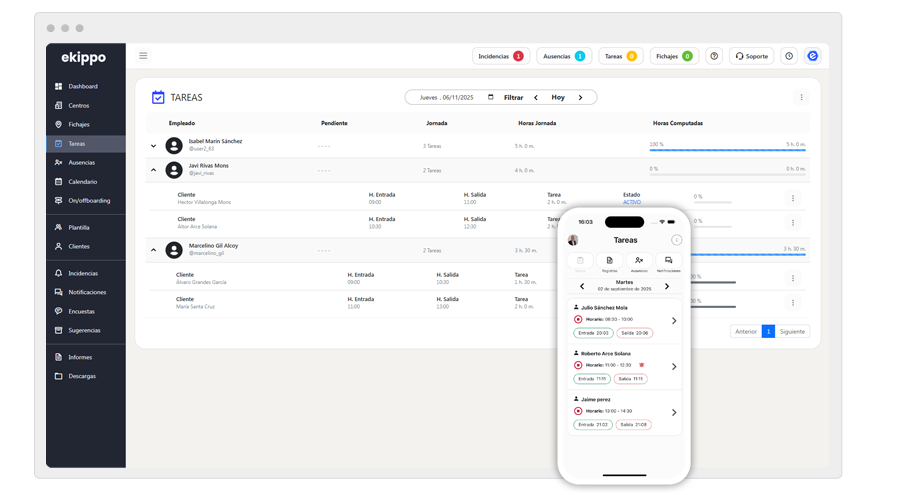 Toda la información de entradas y salidas de tu personal centralizada y accesible de forma cómoda y óptima desde tu panel de control.